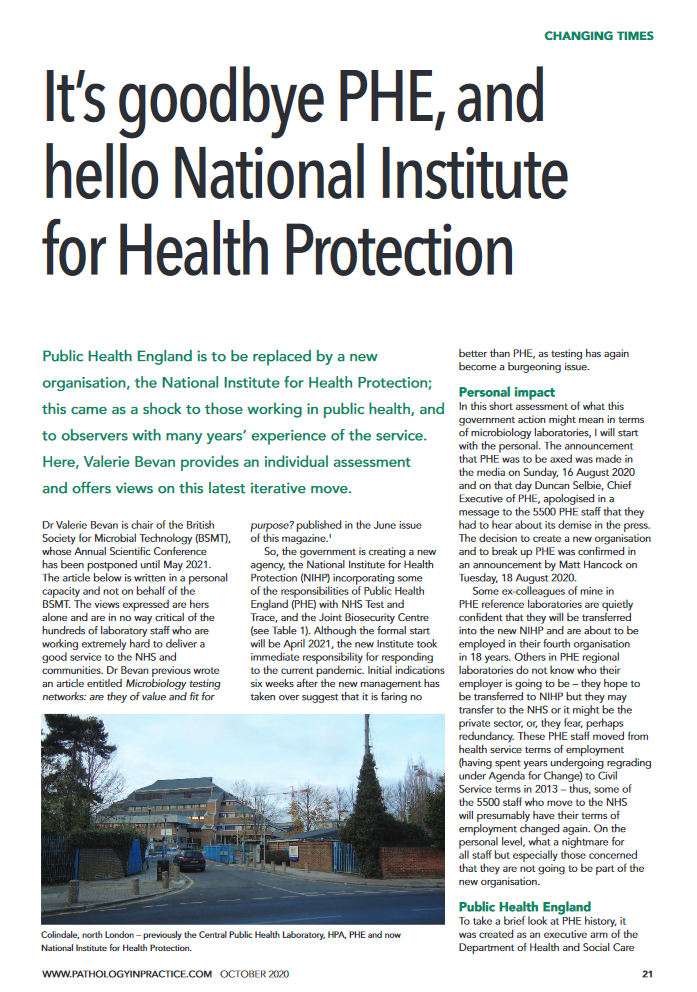 It’s goodbye PHE and hello National Institute for Health Protection by Dr Valerie Bevan (Pathology in Practice, October 2020).
